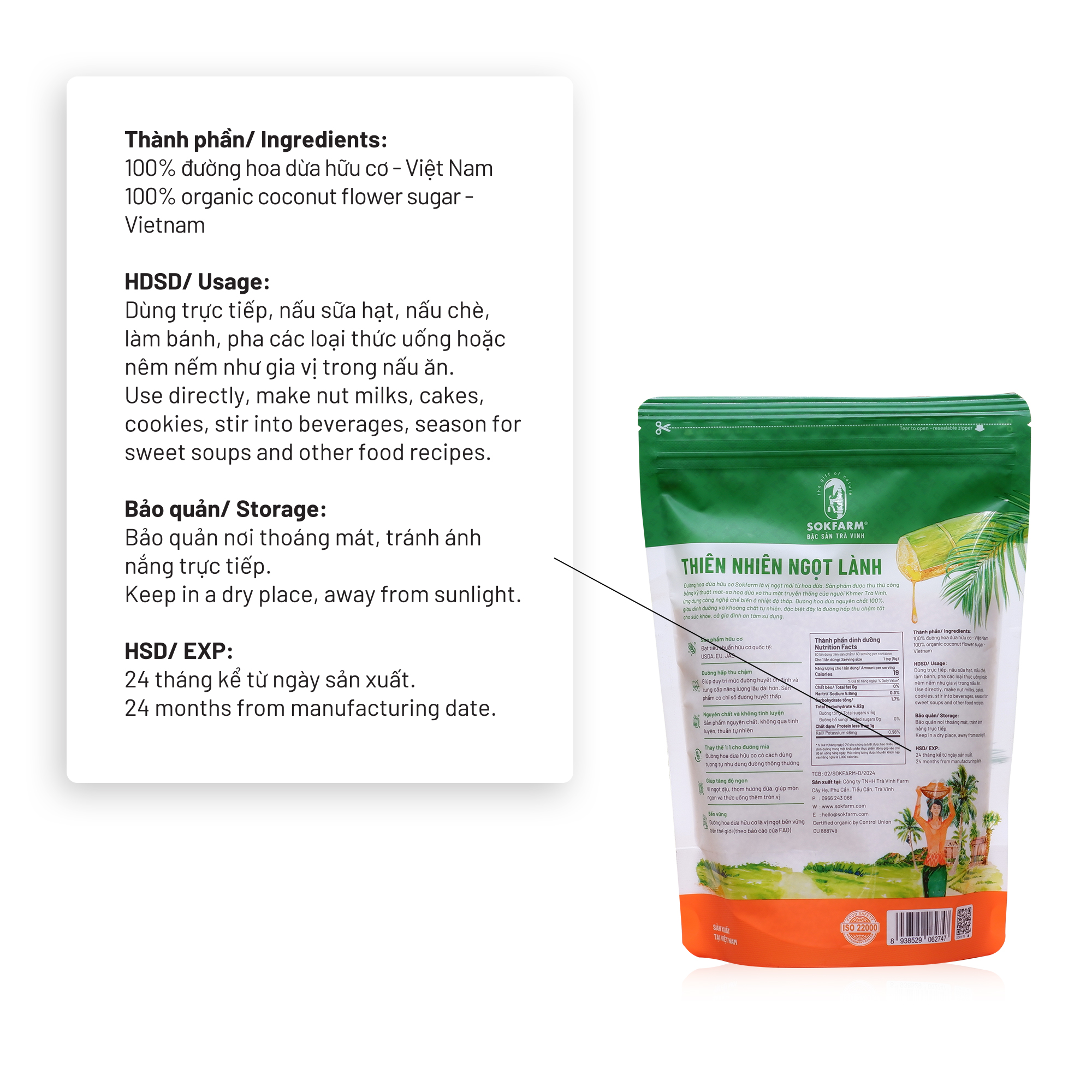 Đường hoa dừa hữu cơ Sokfarm là vị ngọt mới từ hoa dừa. Sản phẩm được thu thủ công bằng kỹ thuật mát-xa hoa dừa và thu mật truyền thống của người Khmer Trà Vinh và ứng dụng công nghệ chế biến ở nhiệt độ thấp. Đường hoa dừa nguyên chất 100%, giàu dinh dưỡng và khoáng chất tự nhiên, đặc biệt đây là đường hấp thu chậm tốt cho sức khỏe, cả gia đình an tâm sử dụng.