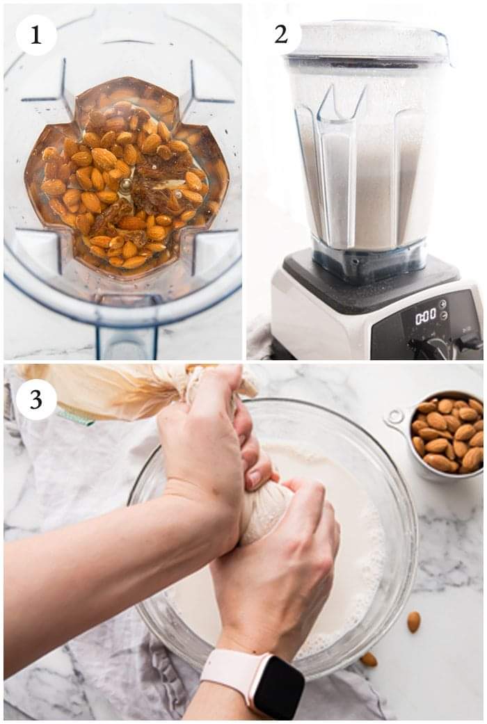Dùng máy xay sinh tố xay hạt hạnh nhân cùng nước lọc trong vòng 1-2 phút chia làm vài lần ấn máy để tránh nóng máy. Nếu dùng chà là hay quả vani thì có thể xay cùng luôn.